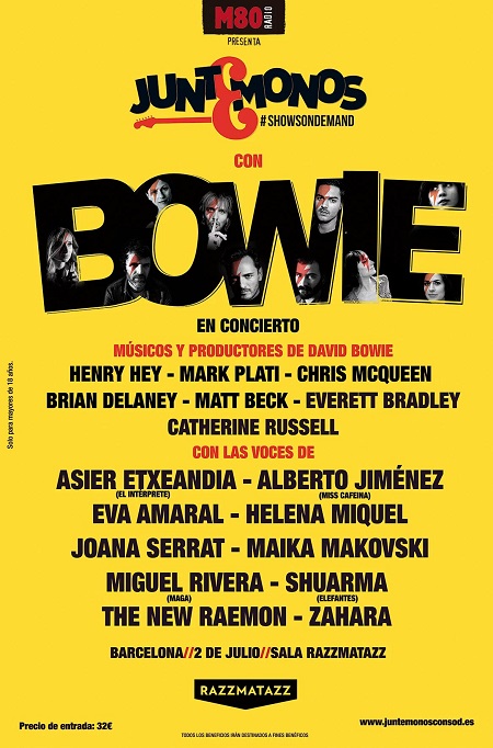 El proyecto #JuntémonosConBowie (iniciativa de Shows on Demand y J&B) contará con Eva Amaral, Iván Ferreiro, Zahara, Pucho de Vetusta Morla, Anni B Sweet, Shuarma de Elefantes, Joana Serrat, Maika Makovski, Juan Alberto de Niños Mutantes, Julio de la Rosa , Alberto de Miss Caffeina, Sean de Second, Javi Vielba de Arizona Baby y Corizonas, Marc Ros de Sidonie o Helena Miquel ex Delafé y Las Flores Azules, Asier Etxeandia, Tulsa y Miguel de Maga entre otros.