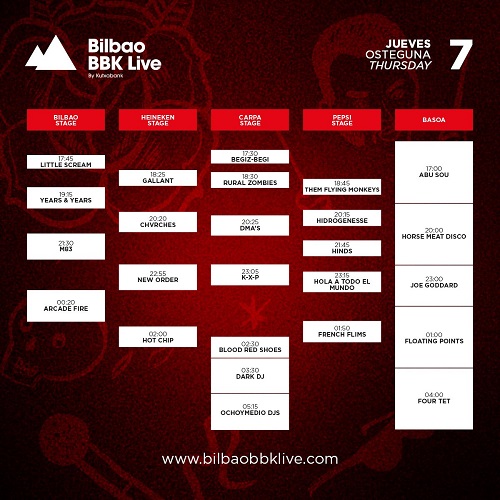 – El jueves habrá que estar atento para coger el autobús que sube al Kobetamendi, porque en cuanto te quieras dar cuenta, ya están Chvrches en escena. Hay que hacer un hueco para Hidrogenesse, parada siempre obligatoria, antes de M83. Aunque su último disco Junk no nos cuadra demasiado, no nos perderemos a los de Anthony González. New Order, al mismo tiempo tras los últimos cambios de horarios que Hola a Todo el Mundo (la coincidencia con Arcade Fire era demasiado) y enseguida los canadienses, que anuncian ya nuevo disco para el año que viene. Y Hot Chip para terminar un día super intenso.