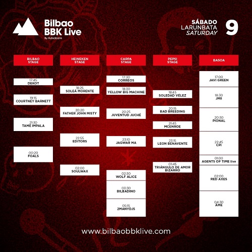 – El sábado empezamos algo más pronto con un enorme trío femenino: Soleá Morente, Soledad Vélez y Courtney Barnett. Vaya puntazo que se han marcado los del BBK con la australiana y con su inmediato seguidor en el escenario, el ex Fleet Foxes (¡que vuelvan ya por favor!) Father John Misty, que dará una lección de clase antes de la psicodelia de Tame Impala. Editors solapan en parte con León Benavente, aunque no nos podemos quejar de este tipo de contratiempos, menores que en otros festivales. Foals y Triángulo de Amor Bizarro serían un enorme fin de fiesta de baile y guitarreo, pero es que además queda la guinda de Wolf Alice, una de las sorpresas del año con su debut, My Love is Cool.
