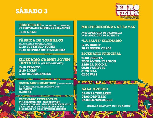 El sábado las actividades matinales a lo largo de toda la ciudad son numerosas e interesantes. A las 11:30 L-Kan en el Ebropeque, especialmente para que los más pequeños se acerquen a la C/ Francisco Cantera para bailar y dar palmas. A la 13:30 una muestra gastronómica en el casco antiguo y los conciertos de Franco, de nuevo L-Kan y nuestros amados Hidrogenesse desde las 15:10.