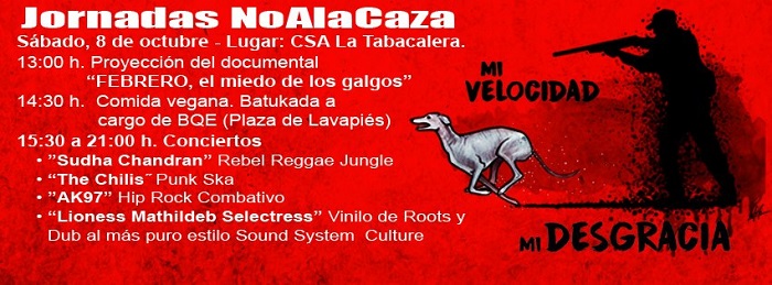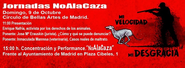 El próximo 8 y 9 de octubre tendrán lugar en Madrid las I Jornadas NO A LA CAZA: «Un año más, coincidiendo con el inicio oficial de la temporada de caza, desde la Plataforma NAC queremos alzar nuestra voz frente a unas prácticas que se cobran, con el sufrimiento gratuito de miles de animales, el tributo a la carencia de empatía de la especie humana. Hemos querido avanzar, dar un paso más y, sin abandonar la reivindicación callejera, elevar nuestro grito antiespecista hacia ámbitos hasta ahora inexplorados; demostrar a todas que además de eslóganes poseemos razones, que tras cada pancarta de los actos públicos que hemos venido convocando y que continuaremos repitiendo en el futuro, se esconden argumentos que merecen trasladarse a cualquier espacio.»