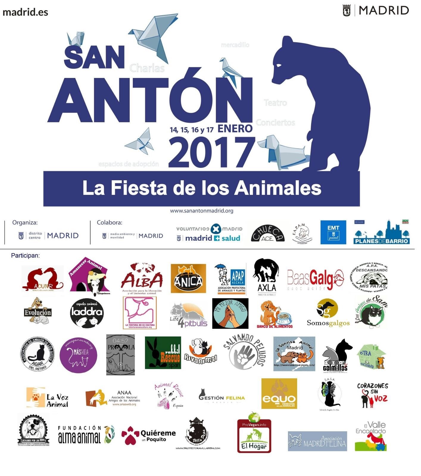 Del sábado 14 al martes 17 de enero celebraremos las Fiestas de San Antón 2017 en Madrid. Cuatro días de fiesta y reivindicación. Unas 30 actividades (charlas, conferencias, mesas informativas, espacios de adopción, teatro, talleres infantiles, conciertos, las tradicionales Vueltas del santo, entre otras) en el entorno de la Iglesia de San Antón (C/ Hortaleza 63. Chueca-Malasaña) y en el Centro de Protección Animal del Ayuntamiento de Madrid (carretera del Barrio de la Fortuna, 33) para rememorar las fiestas de San Antón, que nacieron en época medieval y tenían por objeto cuidar de forma colectiva a los animales que de manera cotidiana vivían en las calles y plazas de la ciudad.