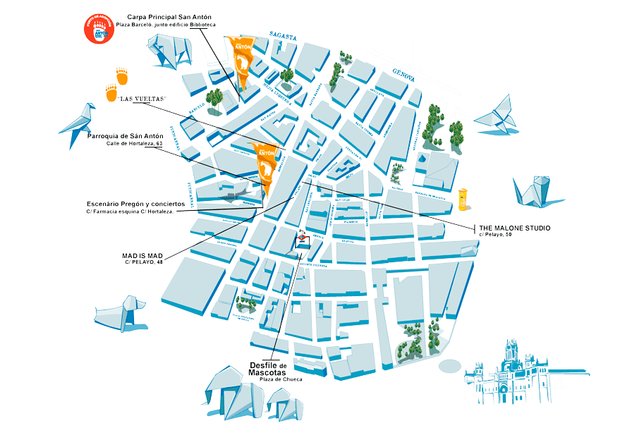 - 17:00 h. Vueltas de San Antón. Salida Iglesia de San Antón, sita en C/ Hortaleza, 63, Travesía de San Mateo, C/ San Mateo, C/ Fuencarral, C/ Hernán Cortés.