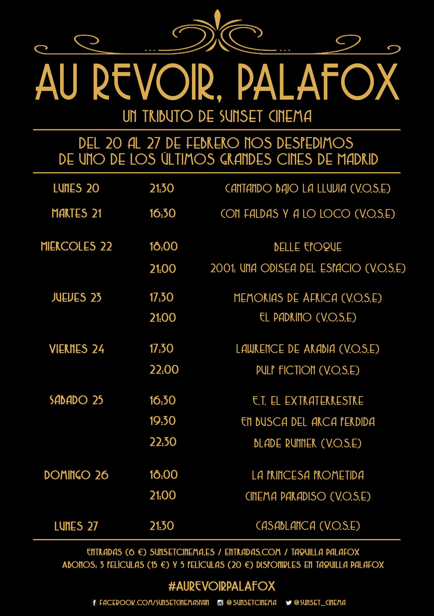 Para despedirse, Sunset cinema ha organizado un ciclo de clásicos del 20 al 27 de febrero para poderlos disfrutar en pantalla grande, lo que viendo la programación es un auténtico privilegio. Podéis comprar la entrada (6,90€) en la propia página de Sunset Cinema y ¡ojo! porque están volando y hay sesiones con todo vendido.