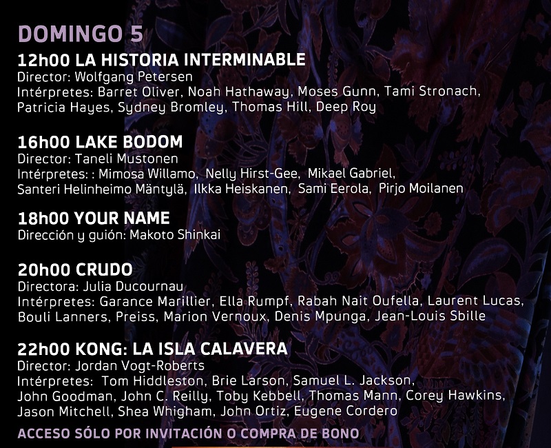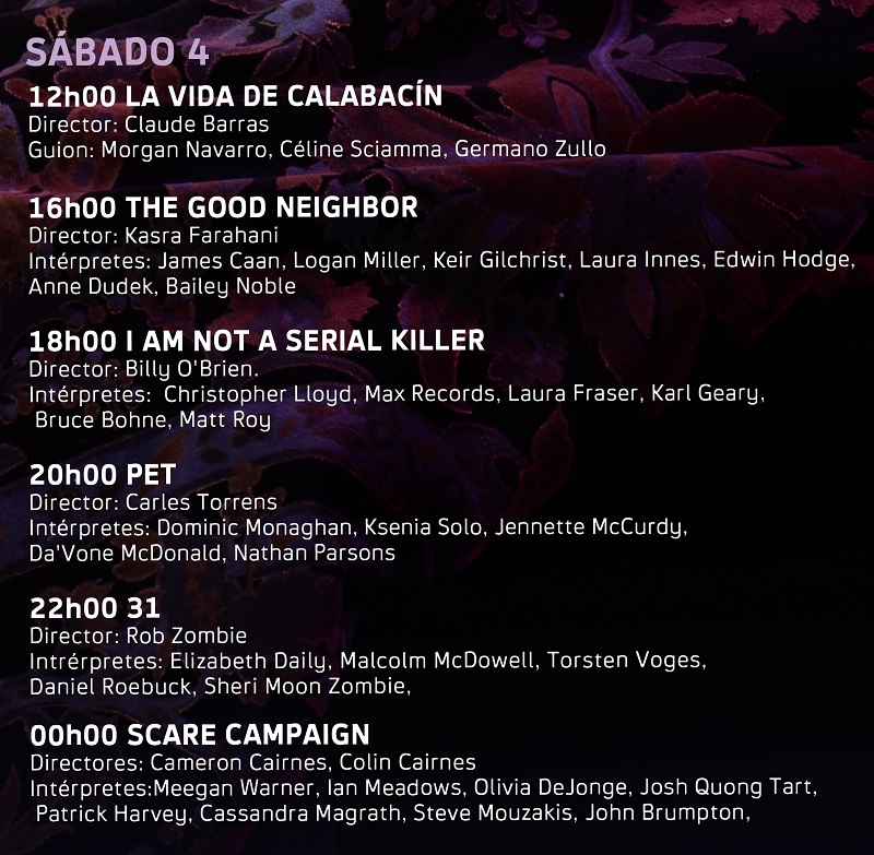 También destacan títulos como 31, la nueva película de Rob Zombie (La casa de los 1000 cadáveres); el anime Your Name, película más vista del año en Japón, y la española Stop Over in Hell, con presencia del reparto. Además tendremos la oportunidad de ver de nuevo en pantalla grande el día 5 en horario matinal (12:00), La historia interminable, el clásico de Wolfang Petersen.