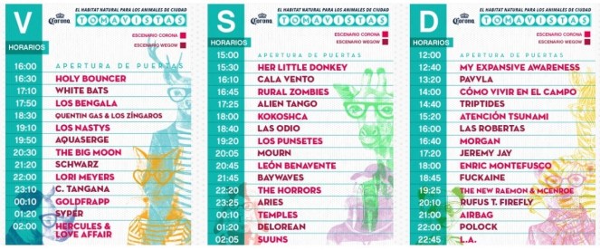 El SÁBADO tenemos ganas de ver a una de las últimas revelaciones de nuestro pop, Kokoshca y a Mourn para ver como ponen fin definitivamente a esos problemas que están teniendo con la publicación de su último disco (Ha, Ha, He) a base de buenos directos. No faltaremos a tres pesos pesados del indie patrio: Los Punsetes que presentan ¡Viva!, Delorean (que una vez más pondrán a todos a bailar con su fantástico Muzik) y León Benavente con nuevas canciones bajo el brazo de su Ep En la Selva. En el apartado internacional no faltaremos a The Horrors, ya los hemos visto unas cuantas veces y aunque somos más de su primer disco (Strange House) siempre consiguen atraparnos con sus atmósferas oscuras. Y de postre Temples, puede que el grupo al que más ganas tengamos de ver, y un verdadero puntazo del Tomavistas. Discípulos adelantados de Tame Impala presentarán las canciones de Volcano.