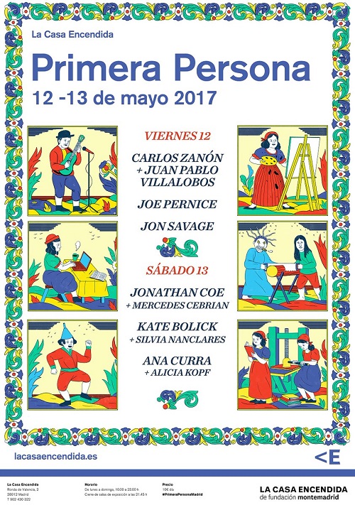 El 12 y 13 de mayo el Patio de La Casa Encendida (Ronda de Valencia 2, Madrid) acoge la 2ª edición de Primera Persona, en paralelo a la celebración de su 6º aniversario en el CCCB de Barcelona. Un festival – dirigido por Kiko Amat y Miqui Otero – que presenta autores de todas las generaciones que compartirán con el público de un modo muy cercano e informal retazos de sus vidas. Lecturas, charlas y actuaciones que los participantes preparan directamente para el festival.