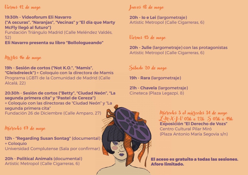 Más de 15 películas y actividades en 6 distritos de Madrid – apostando por llevar la cultura y la diversidad a otros lugares que no sean el centro de la ciudad – para celebrar y visibilizar el amor entre mujeres a través de la cultura cinematográfica. Muchas de las proyecciones contarán con la presencia de las actrices y directoras de las mismas, siendo el coloquio con el público posterior una ocasión de conocer más sobre su trabajo.