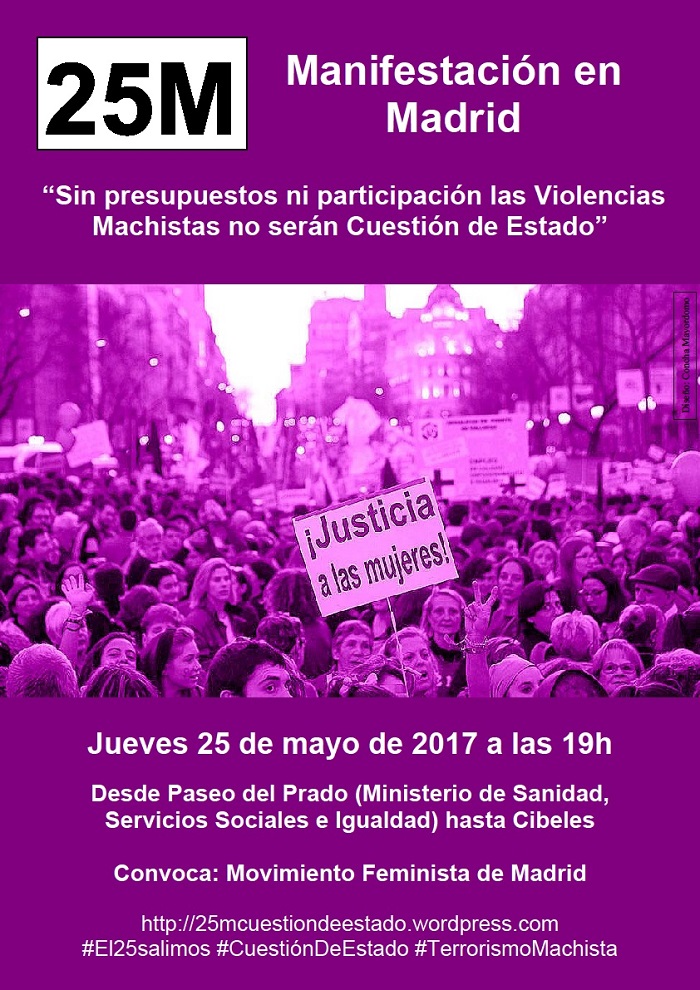 «El Movimiento Feminista de Madrid, ante la prevista aprobación simultánea en junio 2017 de los Presupuestos Generales del Estado (PGE) para 2017 y de la propuesta de la Subcomisión del Congreso de l@s Diputad@s de ‘Pacto de Estado contra la Violencia de Género’, convoca Manifestación en Madrid, el jueves 25 de mayo de 2017, a las 19 h, desde el Paseo del Prado a la altura del Ministerio de Sanidad, Servicios Sociales e Igualdad hasta Cibeles.»