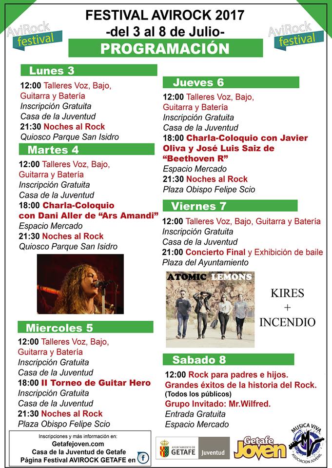 Tras la primera edición de AviRock en 2016, del 3 al 8 de julio vuelve AviRock Festival 2017 (proyecto de la Casa de la Juventud y Asociación Juvenil Música Viva) con multitud de actividades para celebrar la semana de la música joven en Getafe: conciertos, charlas-coloquios, talleres de música…