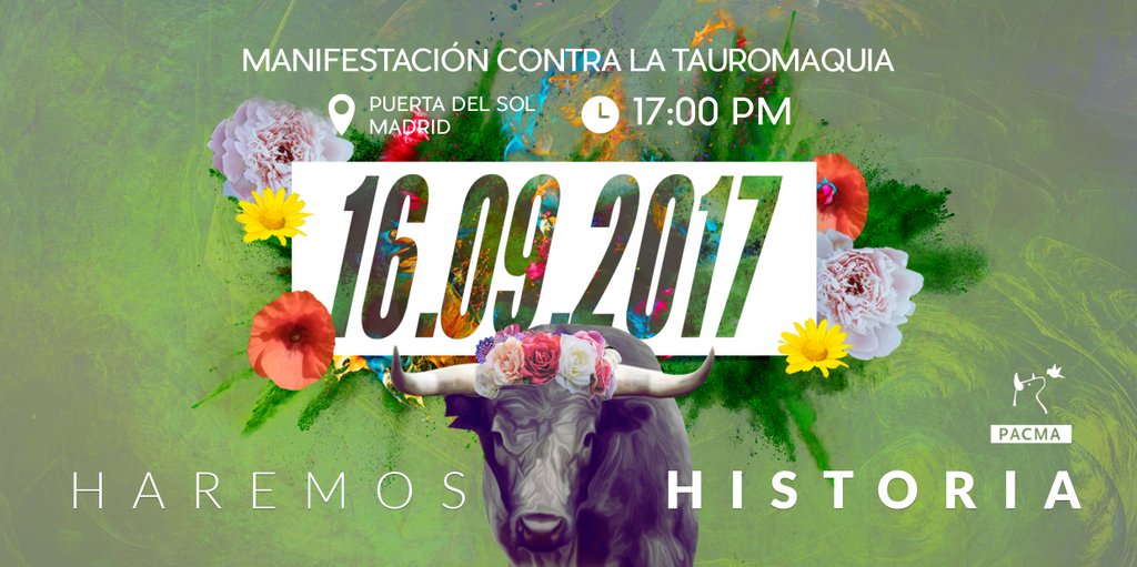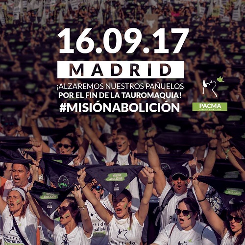 El Partido Animalista (PACMA) convoca una manifestación el sábado 16 de septiembre de 2017 en Madrid para exigir la abolición de los espectáculos taurinos en España.