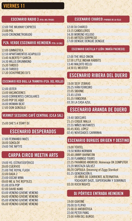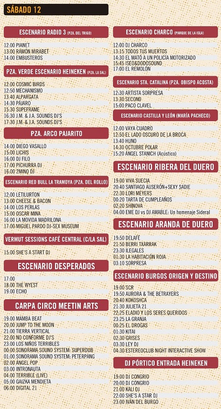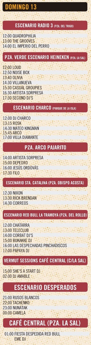 El domingo empieza a bajar el ritmo de número de conciertos, pero hay que ver a Depedro, Rusos Blancos, Nunatak, Tachenko y por supuesto Camela (a ver quién es el guapo que no se sabe sus canciones…).
