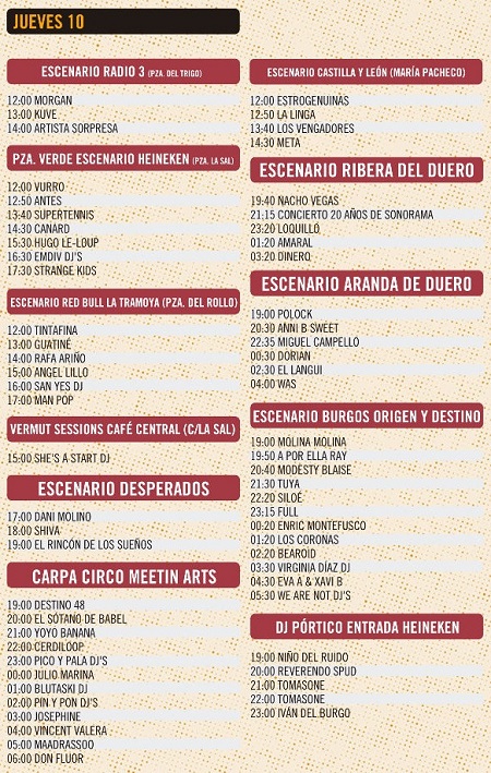 El jueves no hay que perderse el Concierto 20 años de Sonorama – coordinado por Charlie Bautista – donde sonarán 20 canciones interpretadas por artistas de diferentes generaciones. Sin duda será un momento muy especial donde participarán algunos de los artistas que también tocan ese día. Loquillo, Amaral, Nacho Vegas o Dorian y también Los Coronas, Anni B. Sweet, Polock, Was y Enric Montefusco.
