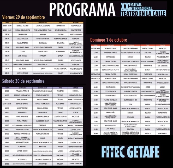 FITEC 2017. La XX edición del Festival Internacional de Teatro de Calle se celebra el próximo fin de semana. Organizado por el Ayuntamiento de Getafe, coordinado por la Compañía Teatro Destellos y patrocinado por Getafe C.F., el arte inundará las calles de Getafe del 29 de septiembre al 1 de octubre con teatro, danza, circo, música…
