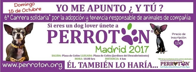 Perrotón España es la Carrera solidaria* por la Adopción y Tenencia responsable de animales de Compañía a iniciativa de Abott Producciones. Dirigida por Alejandra Botto, su objetivo es promover y fomentar la adopción y tenencia responsable de animales de compañía. En sus cinco ediciones anteriores ha contado con una participación de más de 11.500 perros acompañados de dueños. * Perrotón destina el 30% de las inscripciones de los participantes a la carrera a la Asociación Nacional Sin Ánimo de Lucro Perrotón, colaborando habitualmente con protectoras con bajos recursos económicos y la UAX.