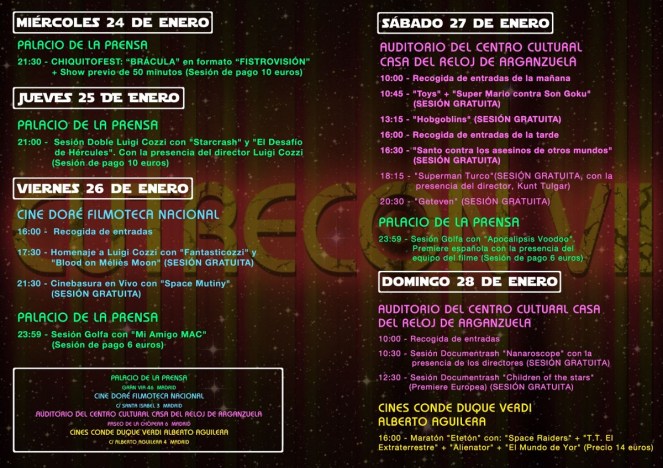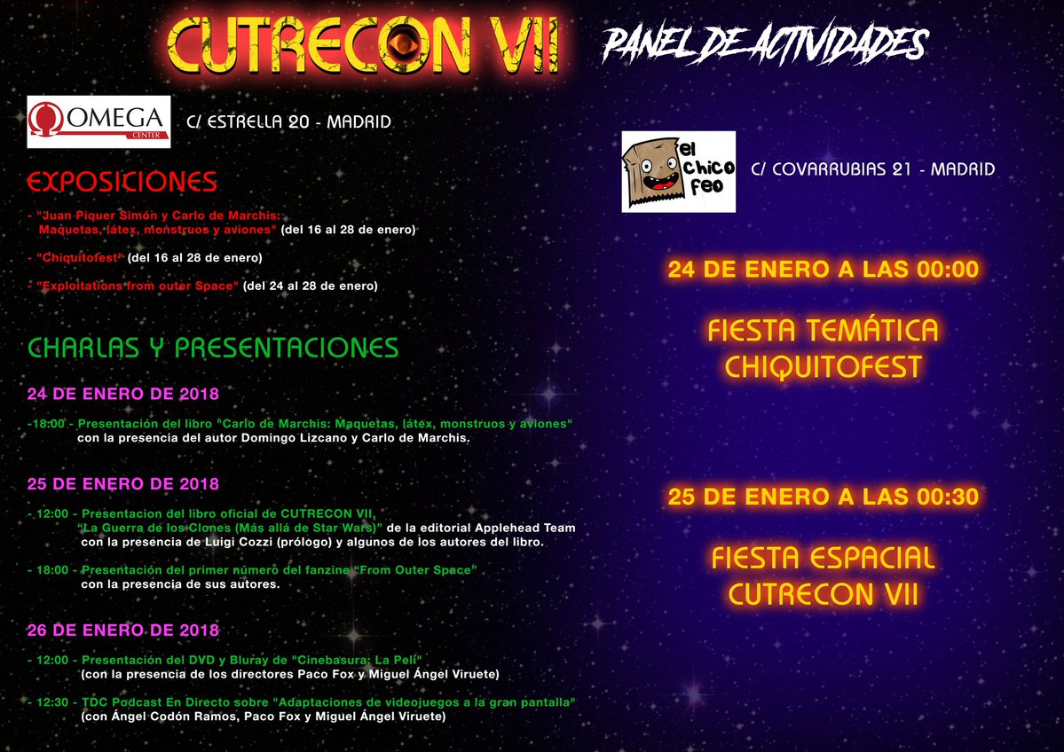 Del 24 al 28 de enero de 2017 se celebra la VII Edición de la CutreCon entre el cine Palacio de la Prensa (C/Gran Vía, 46), los cines Conde Duque Verdi (C/Alberto Aguilera, 4), el Cine Doré (C/Santa Isabel, 3) y el Centro Cultural Casa del Reloj – Matadero (Paseo de la Chopera, 6). El Festival Internacional de Cine Cutre de Madrid regresa para traer a la capital algunas de las peores películas que pueden verse en una pantalla de cine, pero manteniendo la filosofía de “tan malas que son buenas”.