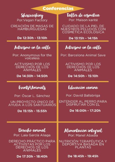 Además, a lo largo de la jornada, se podrá asistir a diferentes conferencias sobre educación canina, derecho animal, activismo, showcooking, cosmética, veterinaria y la presentación del proyecto Events4Animals.