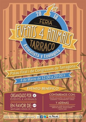 El próximo domingo 4 de marzo se celebra la primera feria animalista y ecológica de la provincia de Tarragona. Organizada por Events4Animals, una asociación que promueve el veganismo y que se de dedica a realizar actividades recaudatorias en beneficio de los santuarios de animales de España, será de 12:00h a 20:00h en el Palau Firal i de Congressos de Tarragona.