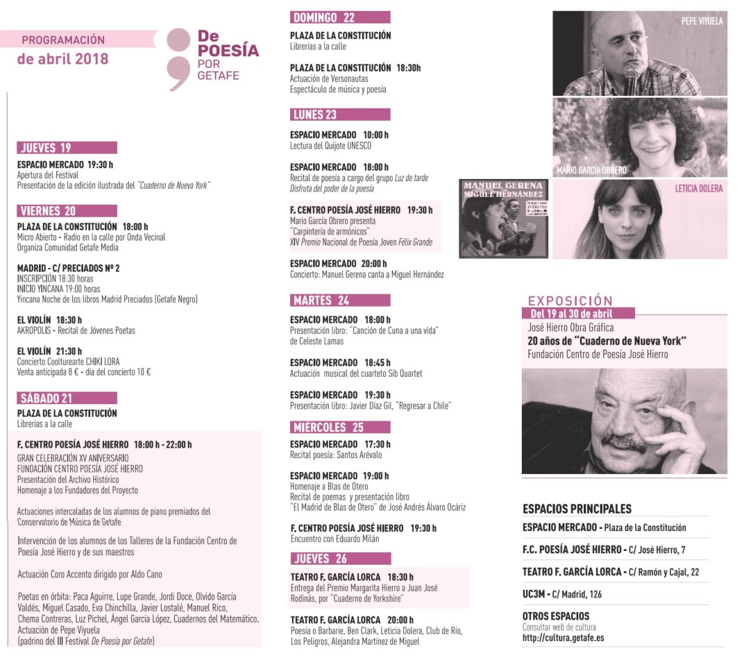 Vuelve el festival De Poesía Por Getafe, que dará la bienvenida a la primavera a través de la poesía. Del 19 al 26 de abril el verso y la rima se convertirán en protagonistas de multitud de actividades especiales programadas en varios puntos de nuestra ciudad. Los lugares más destacados para esta celebración serán el Espacio Mercado, la Fundación Centro de Poesía José Hierro y el Teatro Federico García Lorca.