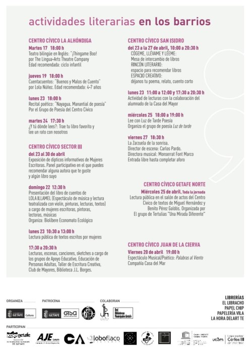 Además habrá actuaciones musicales a cargo de Manuel Gerena, Chiki Lora o Club del Río y el encuentro poético ‘Poesía O Barbarie’ con Leticia Dolera entre otras invitadas. También se realizarán lecturas y actividades literarias en los Centros Cívicos, la Yincana ‘Noche de los libros’, recitales, la lectura de El Quijote, la presentación de poemarios y libros, un homenaje a Blas de Otero o la exposición ‘20 años de Cuaderno de Nueva York. Obra gráfica de José Hierro‘.