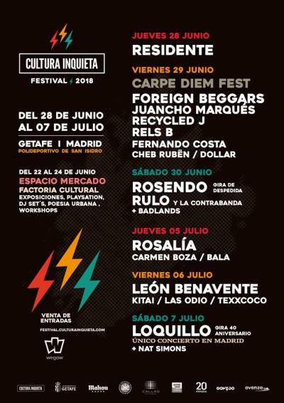 Ya conocemos el cartel de la novena edición de uno de los mejores festivales de nuestro país. Cultura Inquieta y su Festival llevan años haciendo enormes esfuerzos por llevar la cultura a las afueras de Madrid, agitando el panorama musical en la zona sur y en concreto en Getafe. Basta ya de no moverse del centro de la capital para disfrutar de la cultura en la afueras, aunque esta sea en mejores condiciones de sonido, comodidad, precios y entorno. Como getafenses reivindicamos y damos fe de que ¡no estamos tan lejos! Sólo a 13 km del centro. El festival está bien comunicado si decides venir en transporte público (autobuses, metrosur y cercanías).
