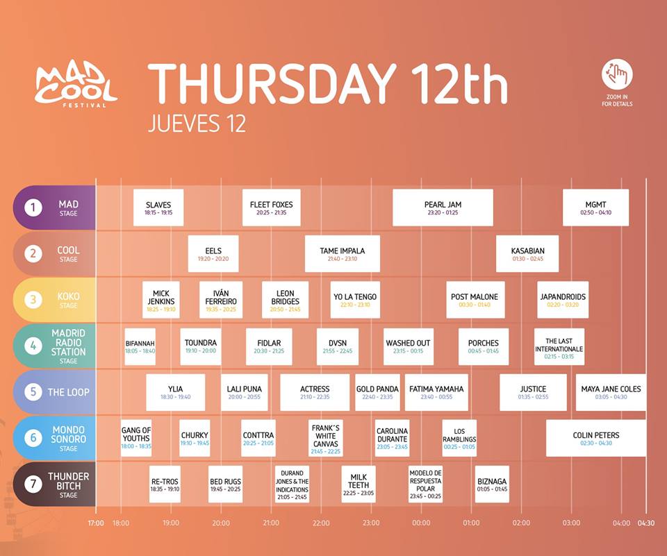 Jueves 12 de julio. Habría que llegar con bastante tiempo de sobra porque la nueva ubicación y el aforo tan brutal que se espera no te asegura llegar a ver la primera banda que te interese. En nuestro caso intentaremos llegar para ver a Slaves a eso de las 18:00 y continuar con Eels (lo sentimos por Toundra e Ivan Ferreiro, que por cierto ¡vaya coincidencia!) pero Mark Oliver Everett es indispensable en nuestro itinerario. Fleet Foxes o Leon Bridges y Tame Impala o Yo la tengo serán decisiones a tomar cuando veamos lo fácil que se puede mover uno por el recinto nuevo y poder luego coger un sitio medio decente para ver a Pearl Jam (miedo me da verlos desde Mordor). Seguramente veremos a Kasabian antes que a Justice y terminaremos con MGMT pasadas las 4 de la madrugada. Para una primera jornada más de 10 horas van a pesar los días siguientes.