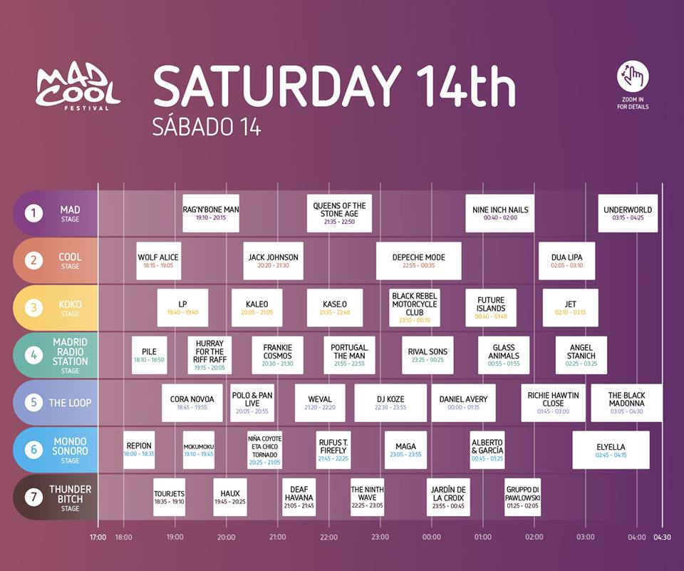 Sábado 14 de julio. Definitivamente las 18:00 será nuestra hora Mad Cool este año. En esta última jornada llegaremos para ver a Wolf Alice y seguir con Kaleo antes de una de las más grandes bandas de Rock & Roll del planeta, Queens of the Stone Age (pero ¿Cómo? ¿Que nos tenemos que perder a los Rufus T. Firefly? ¡ARGGG!). Depeche Mode también son obligatorios pero duele no ver a Black Rebel Motorcycle Club y también a Rival Sons (tres a la vez ya si que es mala idea) y encarar la recta final con Nine Inch Nails o Future Island, ver la resurrección de los Jet y si las piernas consiguen mantenerse en pie terminar con Underworld.
