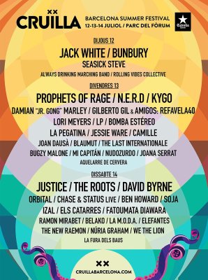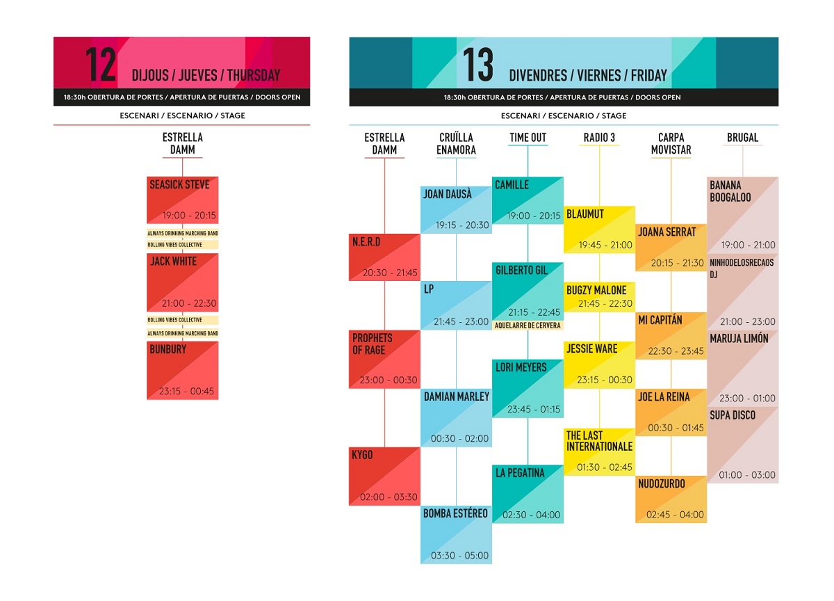 Viernes 13. Alrededor de las 20:00 hay que llegar para ver a Joana Serrat al menos hasta que empiece Gilberto Gil (los horarios se solapan algunas veces, los finales de unos, con los comienzos de otros). Intentaremos acercarnos un rato a Mi Capitán antes que empiecen los Prophets of Rage, la super banda formada por miembros de Rage Against the Machine, Public Enemy y Cypress Hill. De allí y dependiendo cómo estén de forma en directo estos últimos, a ver lo máximo posible a Lori Meyers y después cerrar el día con Nudozurdo y Bomba Estéreo a eso de las 5:00.
