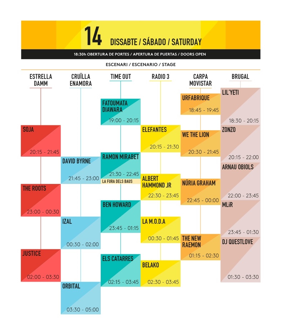 Sábado 14. De nuevo a las 20:00 para ver a Elefantes antes de uno de los puntazos que se ha apuntado este año el festival, el grandérrimo ex-lider de Talking Heads, David Byrne. Lo sentimos por The Roots y Albert Hammond jr. pero nos acercaremos a ver que se cuenta Nuria Graham. Ben Howard, The New Raemon y aunque nos hacía mucha ilusión hacer doblete bailongo con Justice y Orbital nos pasaremos a rockear antes con Belako.