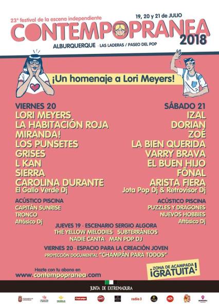 El año en que se homenajea a Lori Meyers, grupo al que el Contemporánea ha visto crecer, habrá que llegar el jueves para disfrutar de la fiesta de presentación en el escenario Sergio Algora (otro de los protagonistas del año porque también se proyectará el documental Champán para todos en El Espacio Creación Joven el viernes a las 12:30).