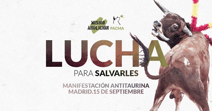 «El próximo 15 de septiembre Madrid se vestirá de blanco y verde. La manifestación dará comienzo a las 17:00h con un acto simbólico en la Puerta del Sol, en homenaje a todos los animales que han sido torturados y ejecutados en nombre de la sádica tradición taurina. Luego marcharemos por las calles de Madrid y haremos que retumben a grito de: ¡Tauromaquia abolición!»