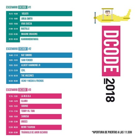 Pues eso que empezaremos con La M.O.D.A. a las 12:15 y no creo que seamos los únicos. A Sidonie le ha tocado el peor horario (sobre todo si el calor aprieta) porque tocarán a las 14:55, pero con Marc, Axel y Jes sobre el escenario sería imperdonable no estar en las primeras filas dándolo todo. Ahí tenemos un parón que se puede utilizar para recuperar fuerzas y volver a tope a las 19:00 para encadenar a Viva Suecia, Albert Hammond Jr. (puede que el artista internacional que más ganas tengamos de ver) y Bastille. Imagine Dragons a priori cabeza de cartel este año, lo tendrán difícil, nosotros no nos perderemos a los incendiarios Berri Txarrak a las 23:30. A The Vaccines tampoco faltaremos a la 01:10, nunca defraudan en directo. Con Kakkmaddafakka haremos una obligada pausa para volver a ver a Triángulo de Amor Bizarro. Y si el cuerpo aguanta terminaremos el Dcode 2018 bailando con Ocho y medio and Friends.