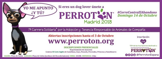 Perrotón España es la Carrera solidaria* por la Adopción y Tenencia responsable de animales de Compañía. Dirigida por Alejandra Botto, su objetivo es promover y fomentar la adopción y tenencia responsable de animales de compañía en la sociedad española. * Perrotón destina el 30% de las inscripciones de los participantes a la carrera a la Asociación Nacional Sin Ánimo de Lucro Perrotón, que colabora habitualmente con protectoras con bajos recursos económicos y a diferentes campañas de comunicación para promover la adopción y tenencia responsable de animales.