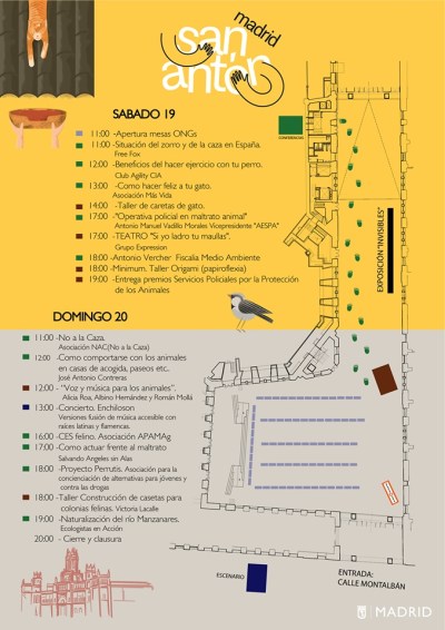 El jueves 17 es el día de la festividad de San Antón y de 10:00 a 20:00 tendrá lugar la popular bendición de animales en la Iglesia de San Antón, a las 17:00 el pregón a cargo del grupo Amaral y a continuación se detallará el ‘sanantón’ del Ayuntamiento, el decálogo de políticas municipales “Madrid, Ciudad Amiga de los Animales”. Diez medidas que, a modo de ofrenda al patrón de los animales, desgranará la alcaldesa, Manuela Carmena: