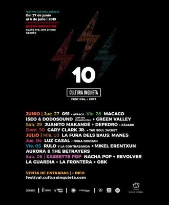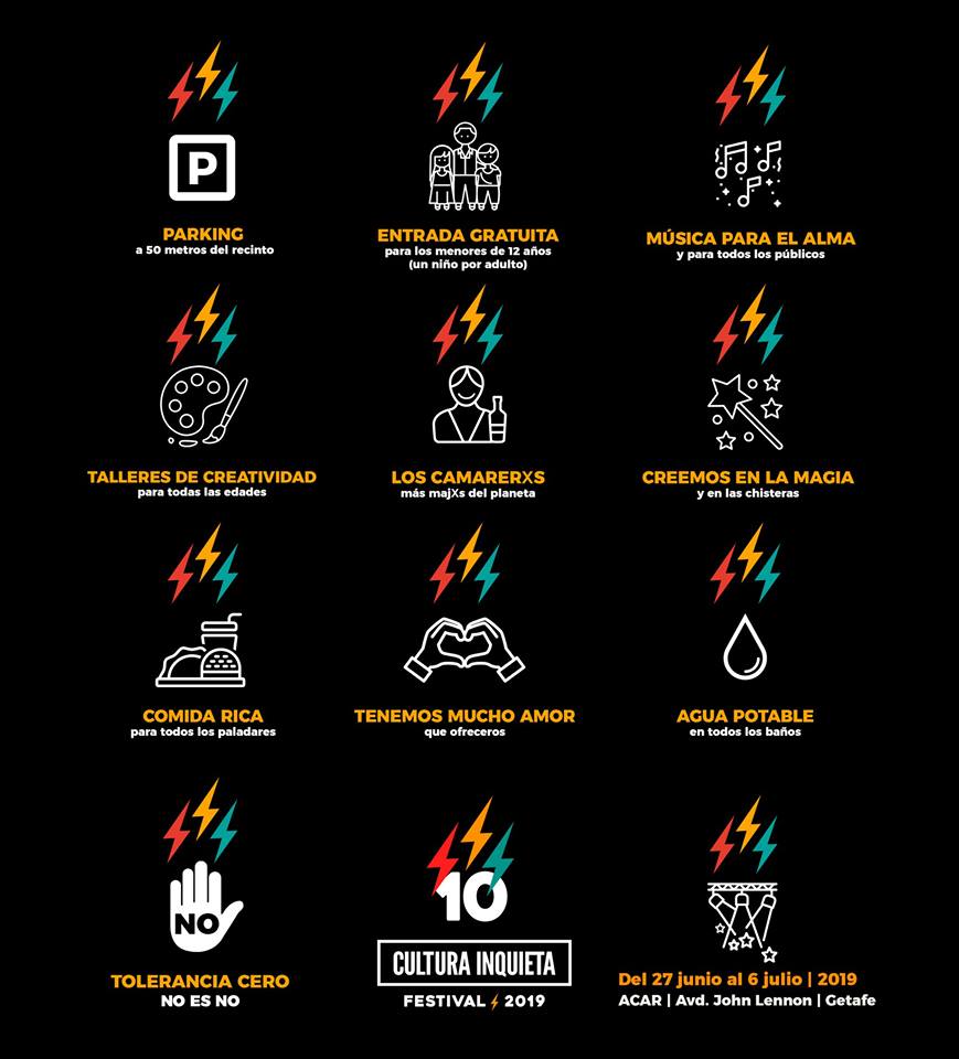Comienza uno de los mejores festivales de nuestro país. Cultura Inquieta y su Festival llevan años haciendo enormes esfuerzos por llevar la cultura a las afueras de Madrid, agitando el panorama musical en la zona sur y en concreto en Getafe. Este año el Festival Cultura Inquieta celebra su 10ª aniversaio en una nueva ubicación, el ACAR (Acuartelamiento Aéreo de Getafe) situado en la avenida John Lennon.