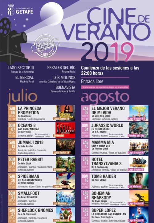 Se abre el ciclo con la película ‘La princesa prometida’, el sábado 6 de julio en el Lago del Sector III, y continúa con ‘Oceans 8. Las estafadoras’ el domingo 7 en El Bercial; ‘Jumanji 2018” el sábado 13 en el Lago del Sector III; ‘Peter Rabbit’ el domingo 14 de julio en Buenavista, ‘Spiderman. Un nuevo Universo’, el sábado 20 en el Lago del Sector III; ‘Smallfoot’ el domingo 21 en Los Molinos; y ‘Sherlock Gnomes’ el sábado 27 de julio en el Lago del Sector III.