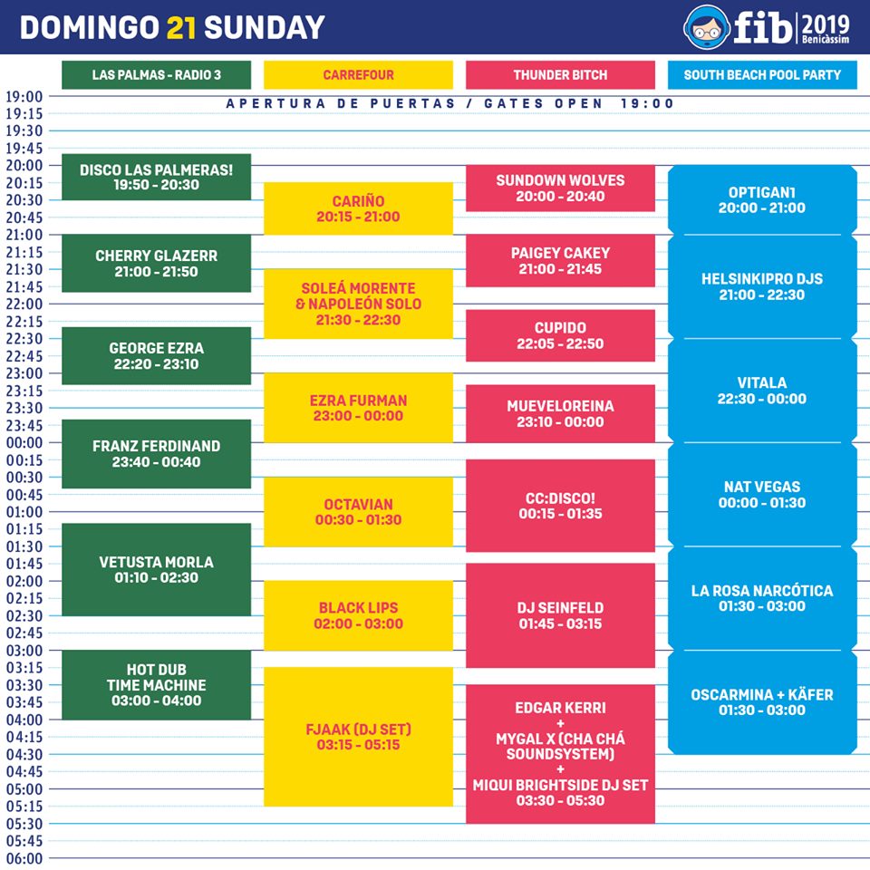 El DOMINGO concatenar a George Ezra, Ezra Furman antes de Franz Ferdinand no está nada mal. Los de Glasgow tienen adn FIB desde hace muchos años, al menos desde que dedicaron Take me out a los que no eran turistas ingleses. Y finalmente Vetusta Morla de cabeza de cartel. Una gran noticia para la música en español, el FIB y por supuesto para los de Tres Cantos. Una lástima que se solapen algo con Black Lips, un seguro para quemar zapatilla, aunque a esas horas y tras varios días de festival…