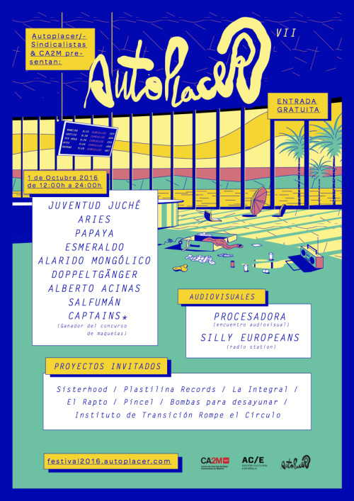 El colectivo Autoplacer / Sindicalistas, en colaboración con el CA2M Centro de Arte Dos de Mayo, presenta la VII edición del Festival Autoplacer. Un festival gratuito para toda la familia que se celebrará en el CA2M de Móstoles el próximo sábado 1 de octubre, con una programación de música en directo (de 12:00h a 24:00h) en la que tocarán algunos… Sigue leyendo VII Festival Autoplacer 2016 en el CA2M