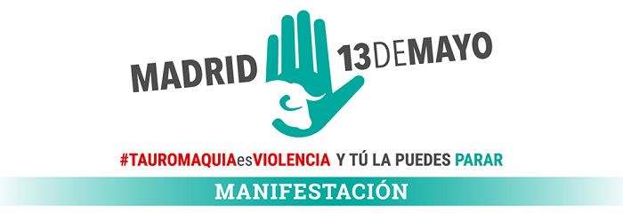 Tauromaquia Es Violencia y tú la puedes parar El próximo domingo 27 de mayo recorremos las calles de Madrid para pedir, una vez más, que desaparezca la tauromaquia. Ya está bien de maltratar, torturar y asesinar animales y que nos quieran vender que es una tradición, que forma parte de nuestra sociedad. No de la mía. No con… Sigue leyendo Manifestación antitaurina, Tauromaquia Es Violencia, el 27 de mayo de 2018 en Madrid