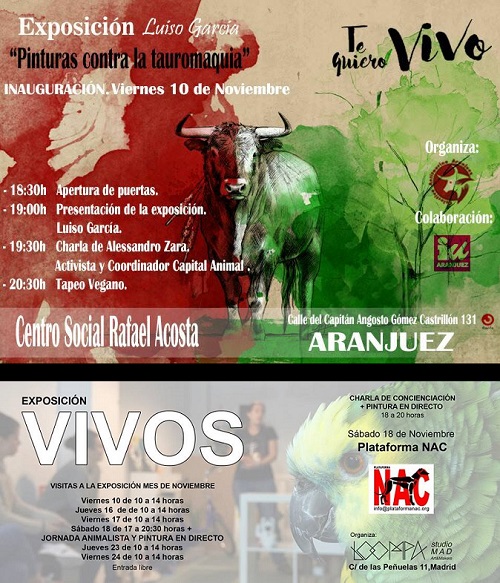 Exposición ‘Pinturas contra la tauromaquia’ El Colectivo Antitaurino Aranjuez organiza la exposición ‘Pinturas contra la tauromaquia’ del artista Luiso García para mostrar la verdadera realidad de la tauromaquia y tirar por tierra los tópicos taurinos. Del 10 al 12 de noviembre podemos visitar (entrada gratuita) las 21 obras que componen la expo en el Centro… Sigue leyendo Exposiciones animalistas en noviembre en Madrid